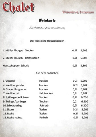 13. Riesling Kabinett Feinherb 0,2l 6,20%u20ac12. Riesling Trocken 0,2l 5,90%u20ac11. Silvaner Trocken 0,2l 5,90%u20ac10. Schwarzriesling Feinherb 0,2l 6,20%u20ac9. Trollinger / Lemberger Trocken 0,2l 6,20%u20ac8. Sp%u00e4tburgunder Rotwein Trocken 0,2l 6,20%u20acWeinkarteDie Welt ohne Wein ist nichts wert.Der klassische Hausschoppen1. M%u00fcller Thurgau Trocken 0,2l 5,90%u20ac2. M%u00fcller Thurgau Halbtrocken 0,2l 5,90%u20acHausschoppen Schorle 0,2l 5,80%u20acAus dem Badischen3. Gutedel Trocken 0,2l 5,90%u20ac4. Wei%u00dfburgunder Trocken 0,2l 5,80%u20ac6. Grauer Burgunder Trocken 0,2l 6,20%u20ac7. Wei%u00dfherbst Halbtrocken 0,2l 6,20%u20ac